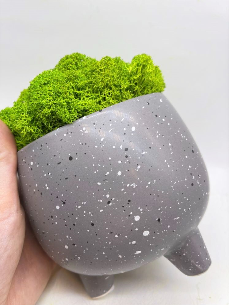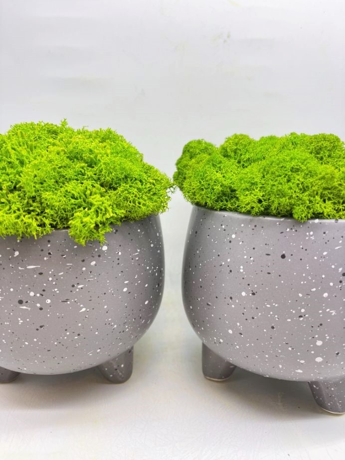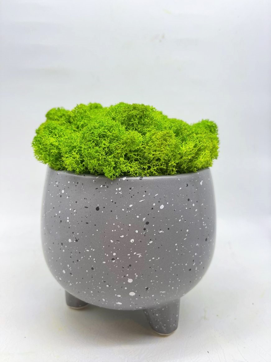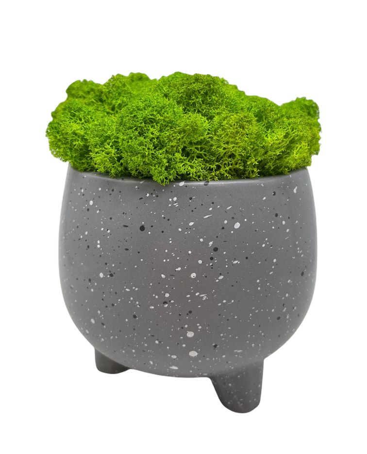 Minimalistický okrúhly betónový kvetináč v sivej farbe s 3 nožičkami, ktorý je doplnený o stabilizovaný lišajník.